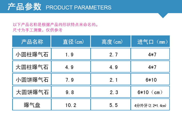 使用壽命長達(dá)10年。特別適用于城市污水、大 型用水工廠新建擴(kuò)建和老曝氣池改造。曝氣頭接口方式有4分口,6分口,可內(nèi)或外螺紋。